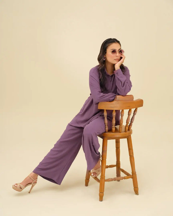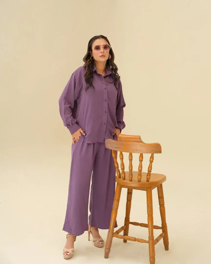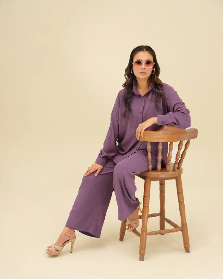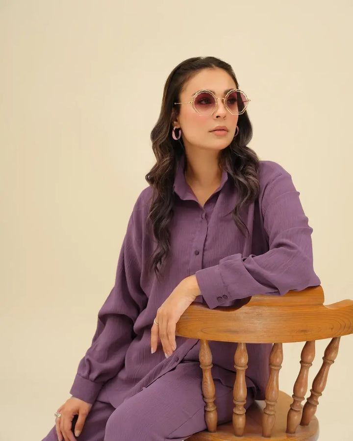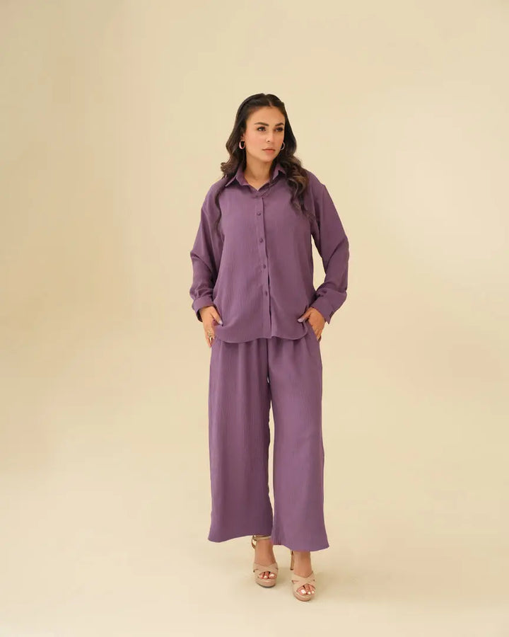 Product Detail: The set includes a collared shirt with button detailing that adds a classic touch, while the soft purple and gray hue brings a fresh and serene vibe. The coordinating pants complete the look with a tailored fit, balancing comfort and sophistication.