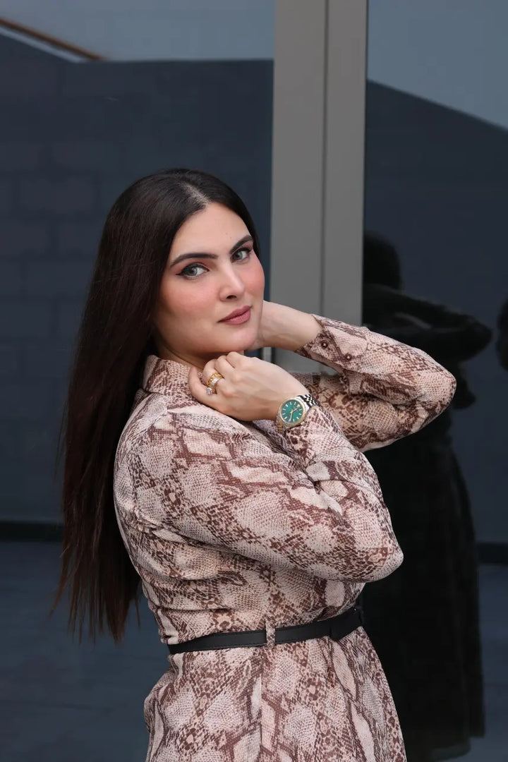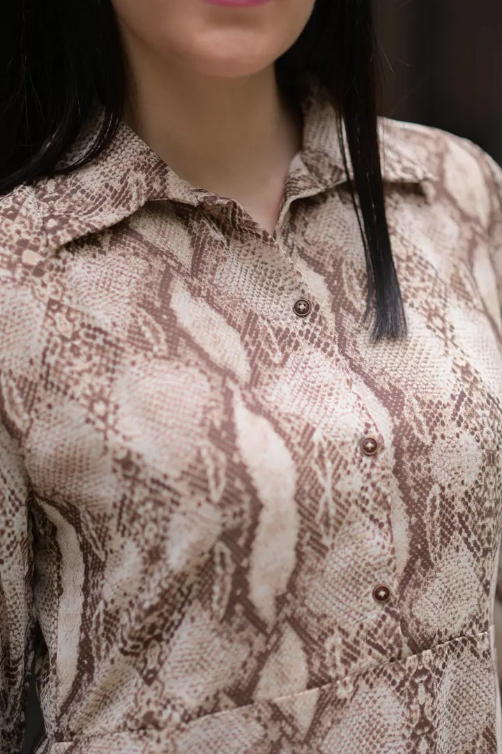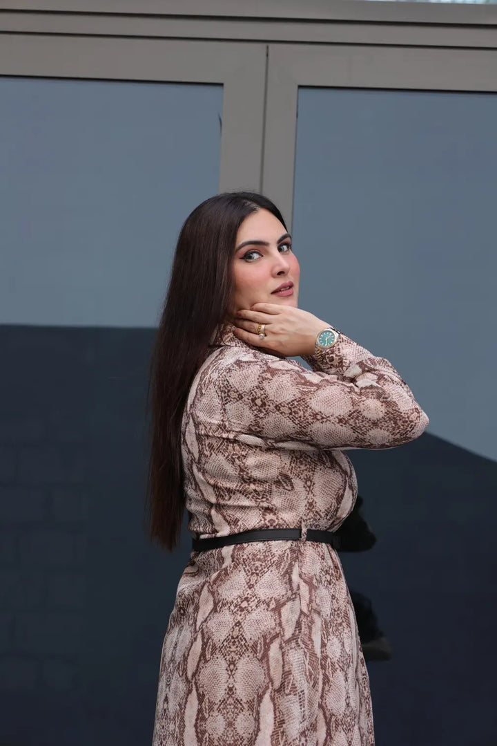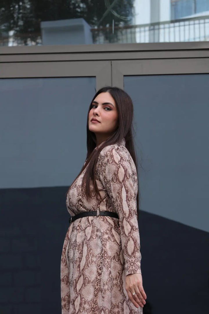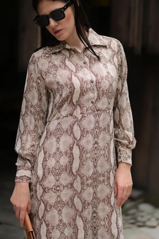 Product Detail: This almond brown snake print chiffon dress blends bold and chic perfectly. The breezy chiffon fabric adds a touch of softness to the fierce print, while its figure-skimming design ensures effortless sophistication