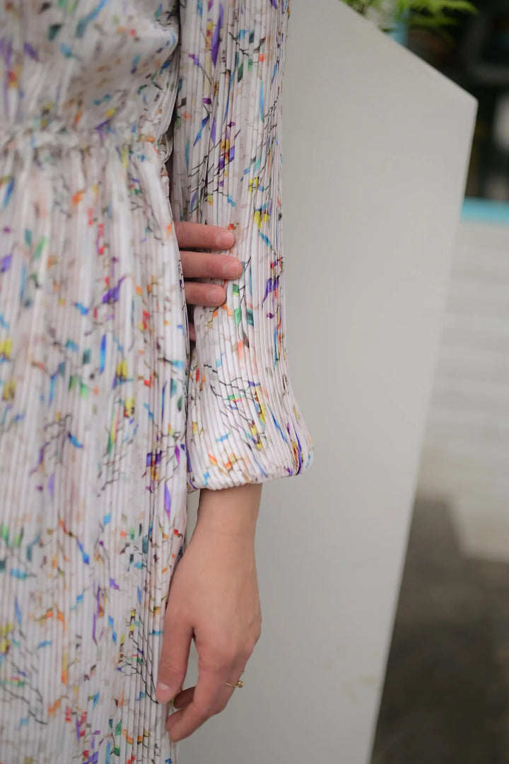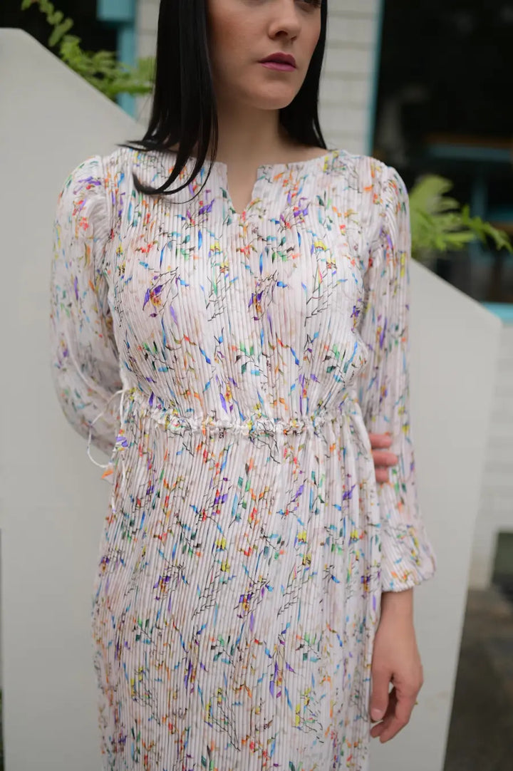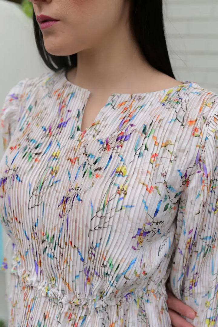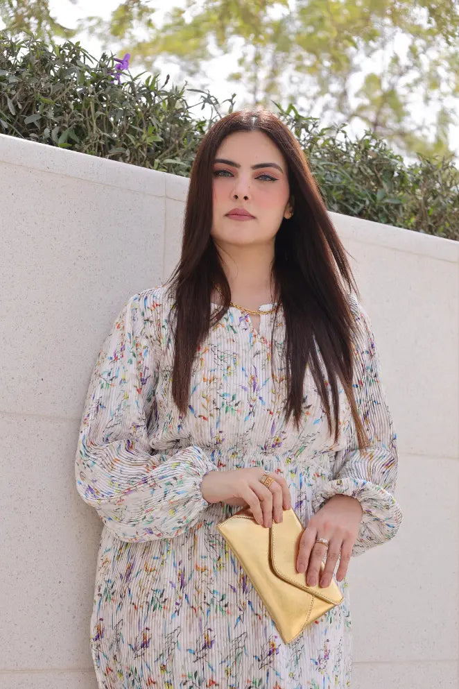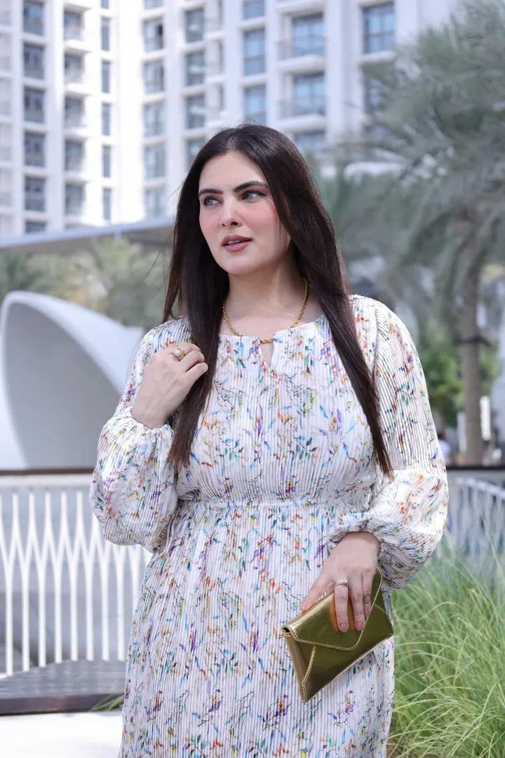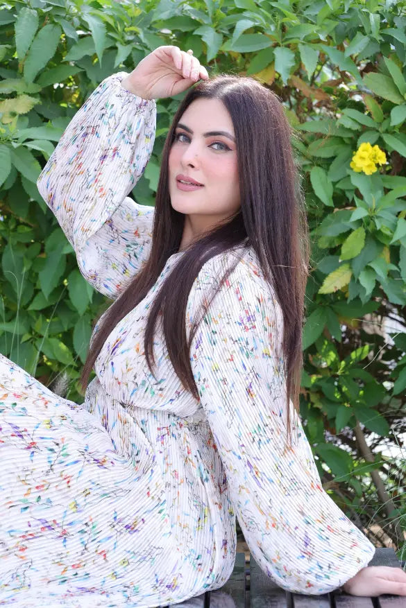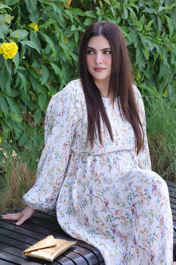 Product Detail: Wrap yourself in effortless elegance with this luxurious white silk dress. Adorned with delicate floral prints, it features a flowy silhouette that flatters all body types. The soft, breathable silk ensures all-day comfort, making it perfect for any occasion where style meets ease.