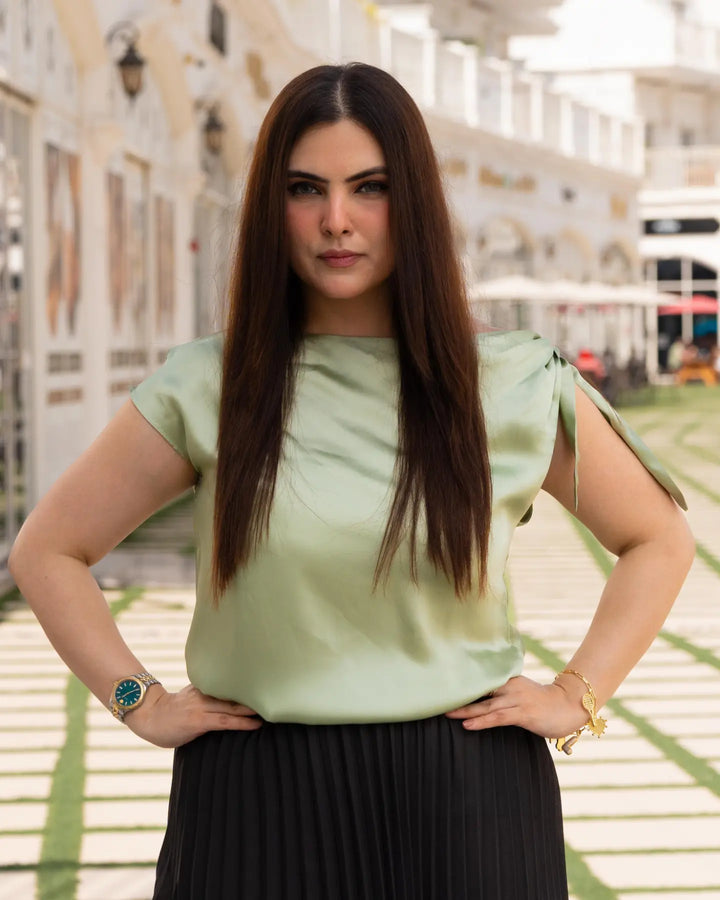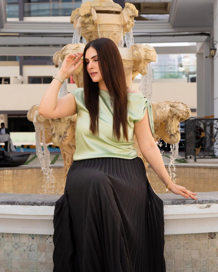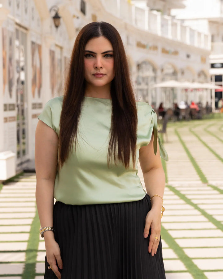 Product Detail: Step into effortless style with this pastel light green silk top. Featuring a delicate side shoulder tie-knot detail, this piece combines elegance and modernity, perfect for both daytime outings and evening affairs.