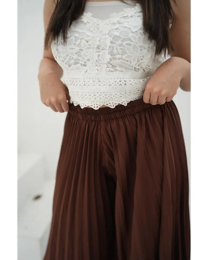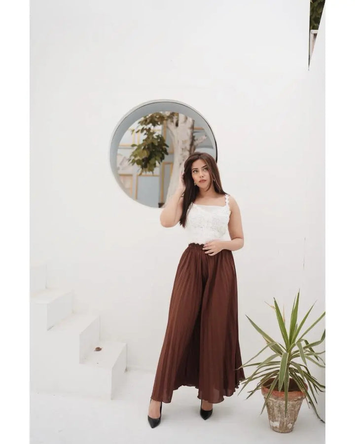 Product Detail: The soft, rich brown hue offers a versatile, neutral tone that pairs easily with a variety of tops, making them a must-have addition to any wardrobe. The pleated front adds subtle texture and structure, creating a flattering, tailored fit that drapes beautifully on the body