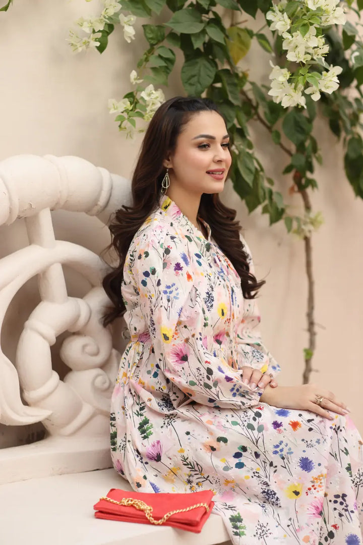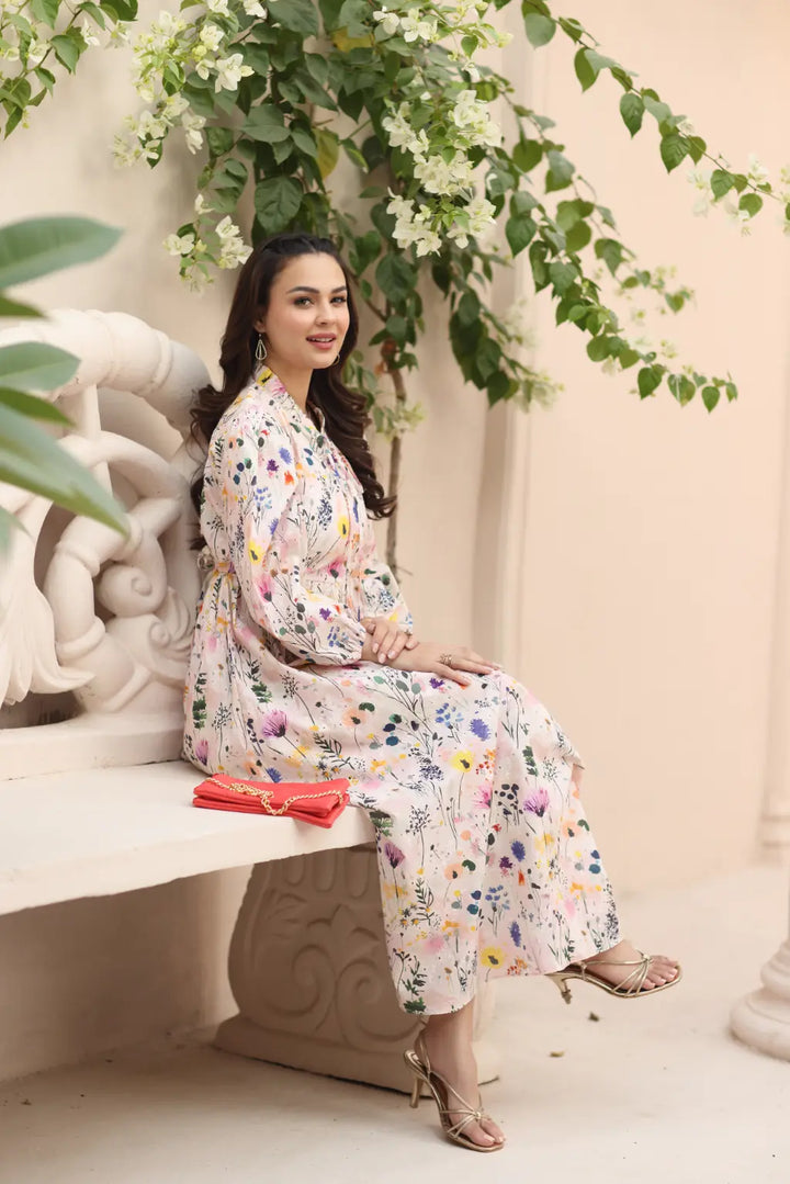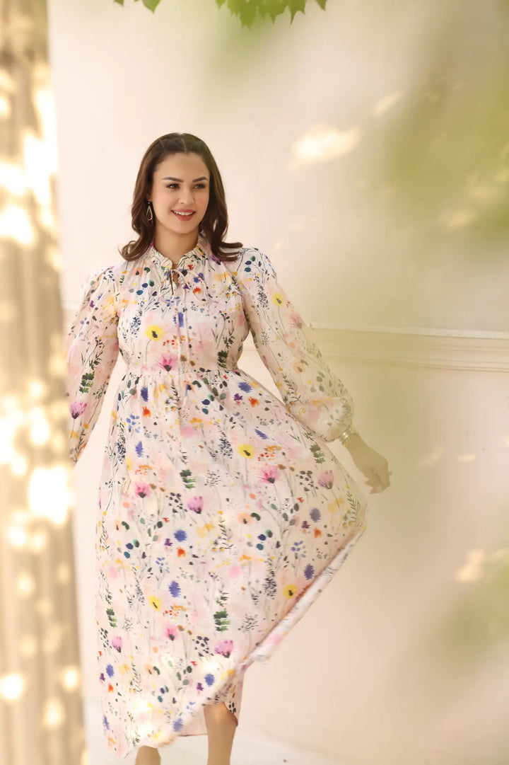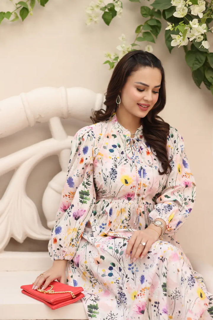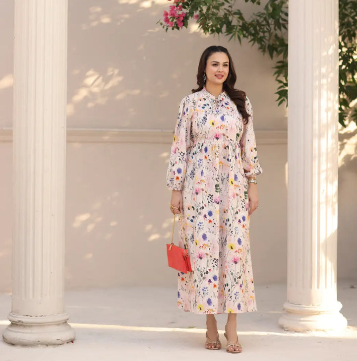 A modern take on classic charm. This Western-style dress features a vibrant wildflower print on a textured cream pink lawn (chicken) base. The defined waist and voluminous sleeves create a stunning, easy-to-wear silhouette.