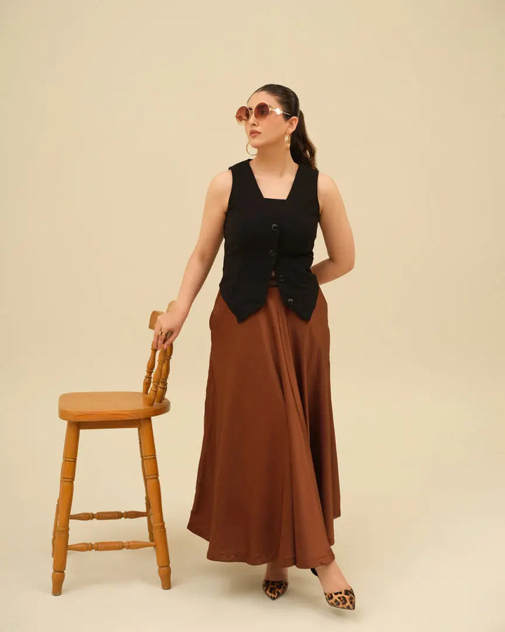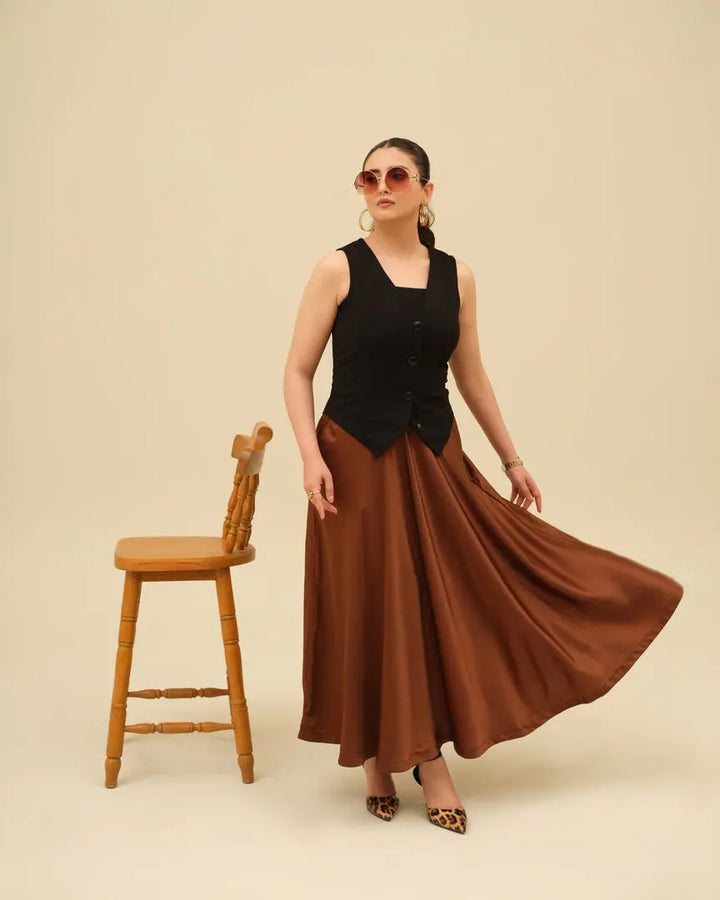 Product Detail: This silk brown velvet skirt exudes effortless luxury and refined elegance. The rich, velvety texture creates a soft, sumptuous feel against the skin, while the deep brown hue adds warmth and sophistication to any ensemble.