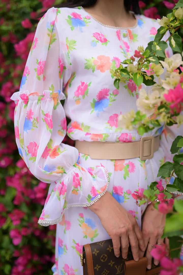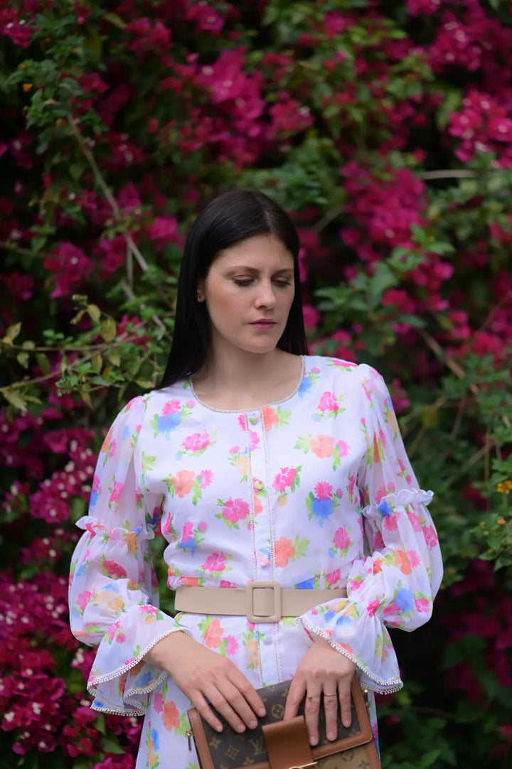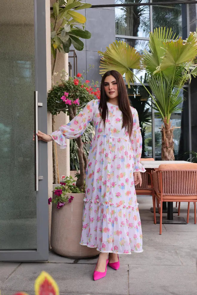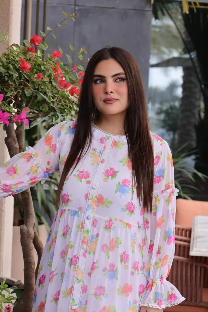 Product Detail: Brighten your wardrobe with this charming chiffon dress! Featuring a lively pink and orange flower print against a crisp snow-white backdrop, this flowy dress is perfect for breezy afternoons, sunny getaways, or just twirling through your day.
