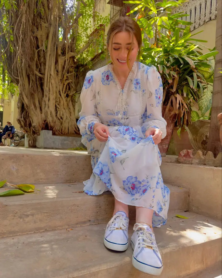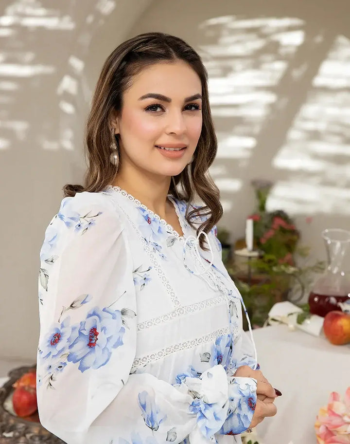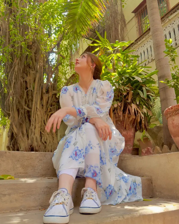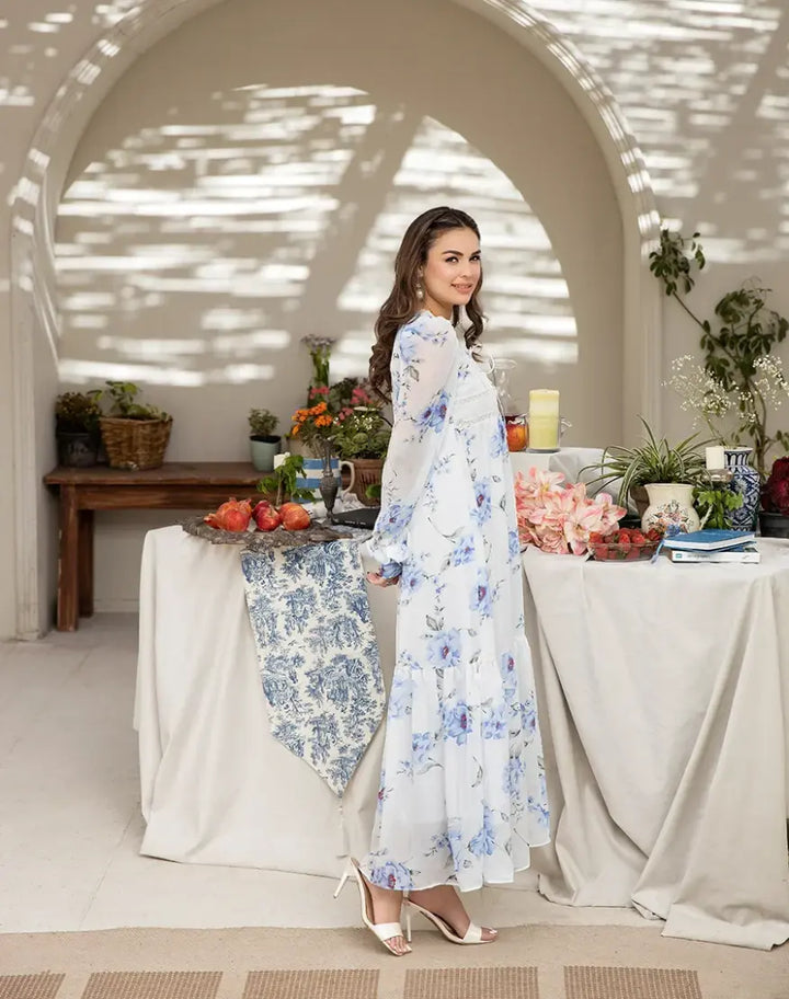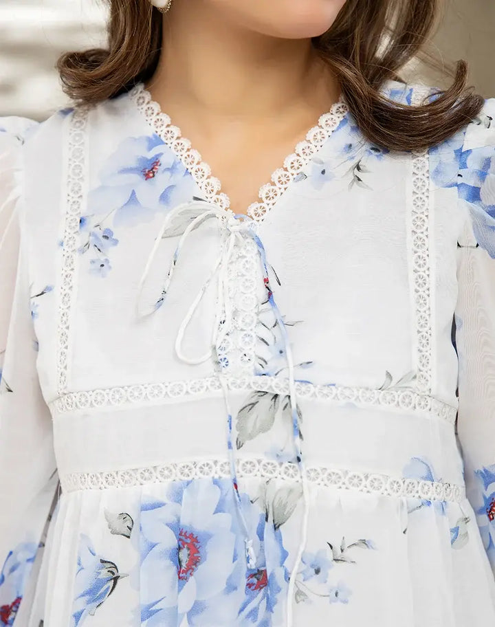 Step into sophistication with our white floral long frock crafted from delicate georgette. The crisp color and elegant floral long frock design create a look of effortless grace, perfect for any formal event or romantic dinner.
