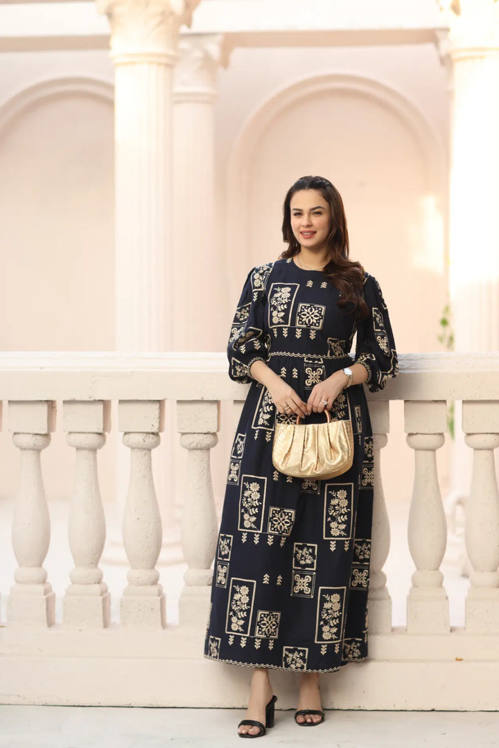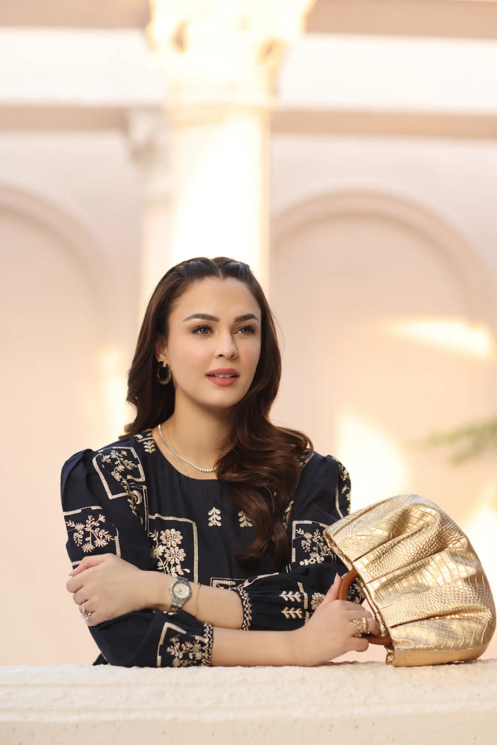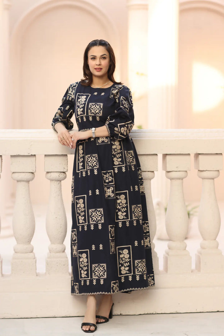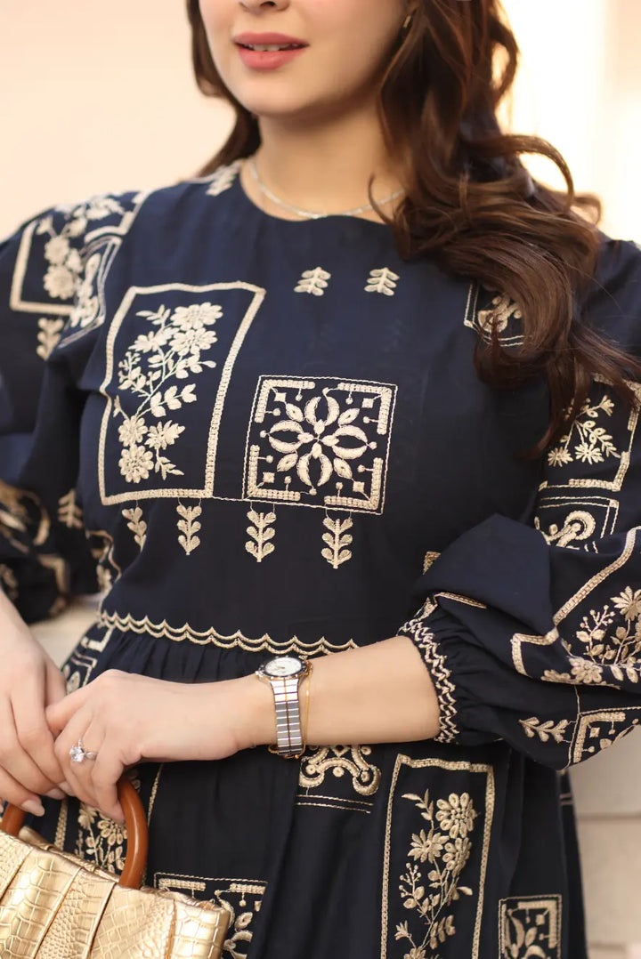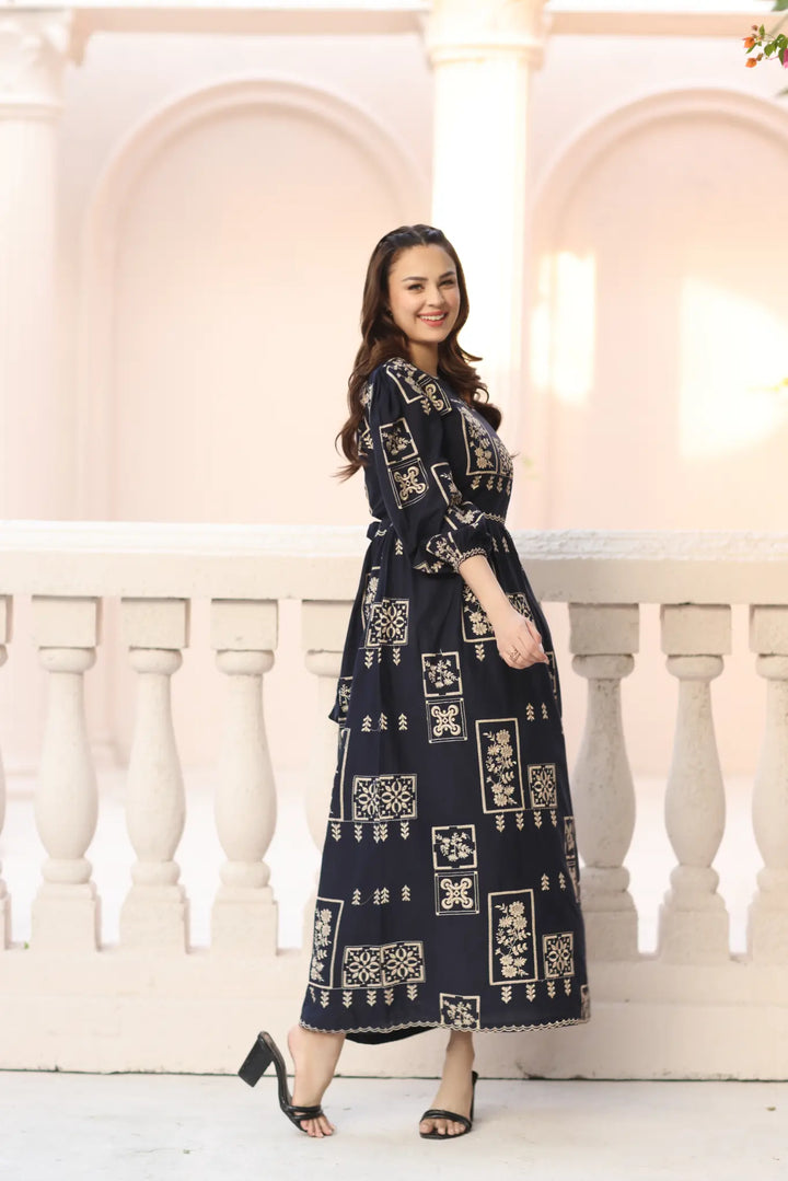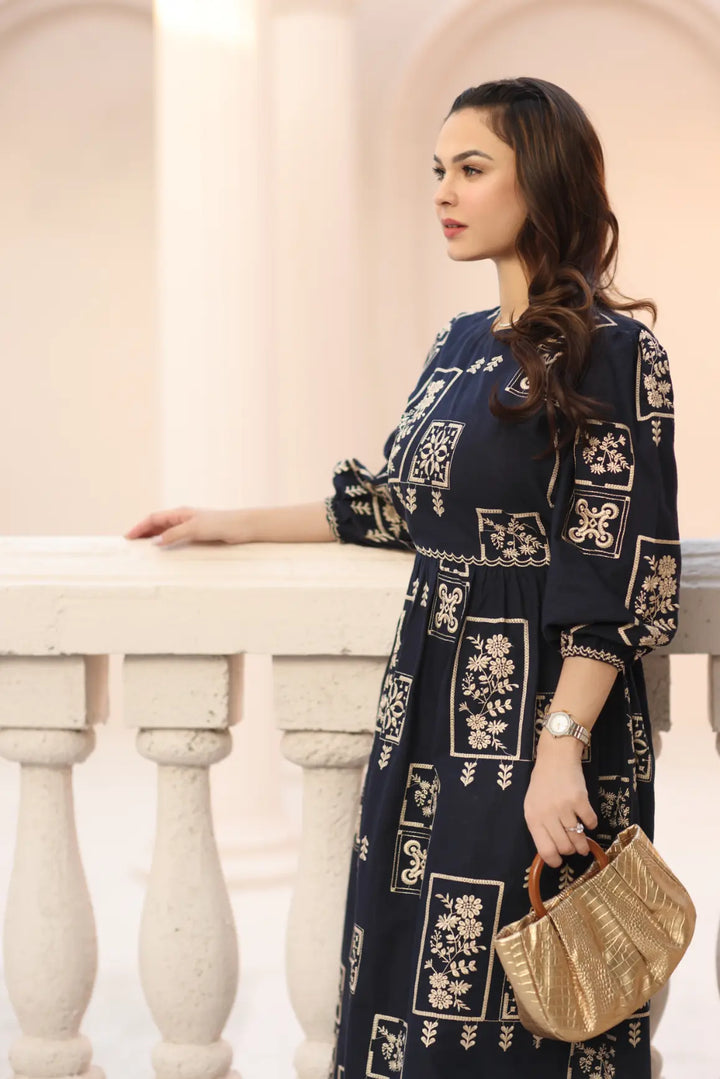 Make a sophisticated statement. This deep navy blue maxi is cut from premium embroidered lawn and features bold, contrasting geometric motifs. The flattering V-neck and matching tie-belt create a defined silhouette, blending modern design with timeless elegance.