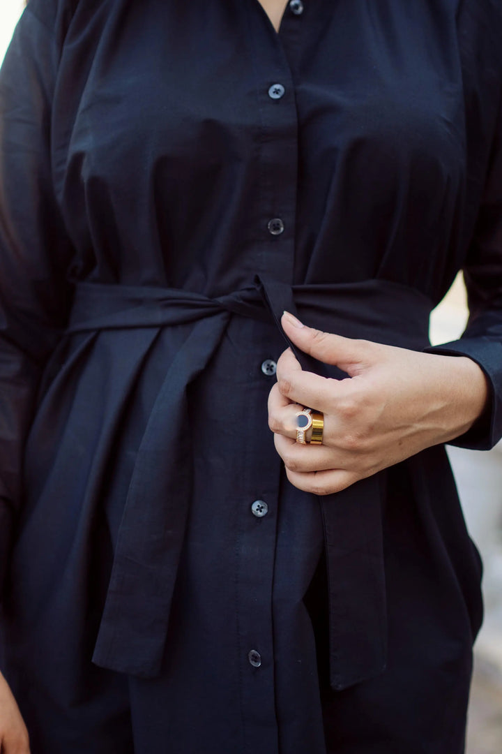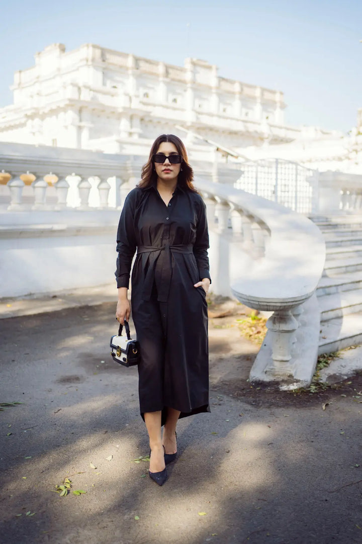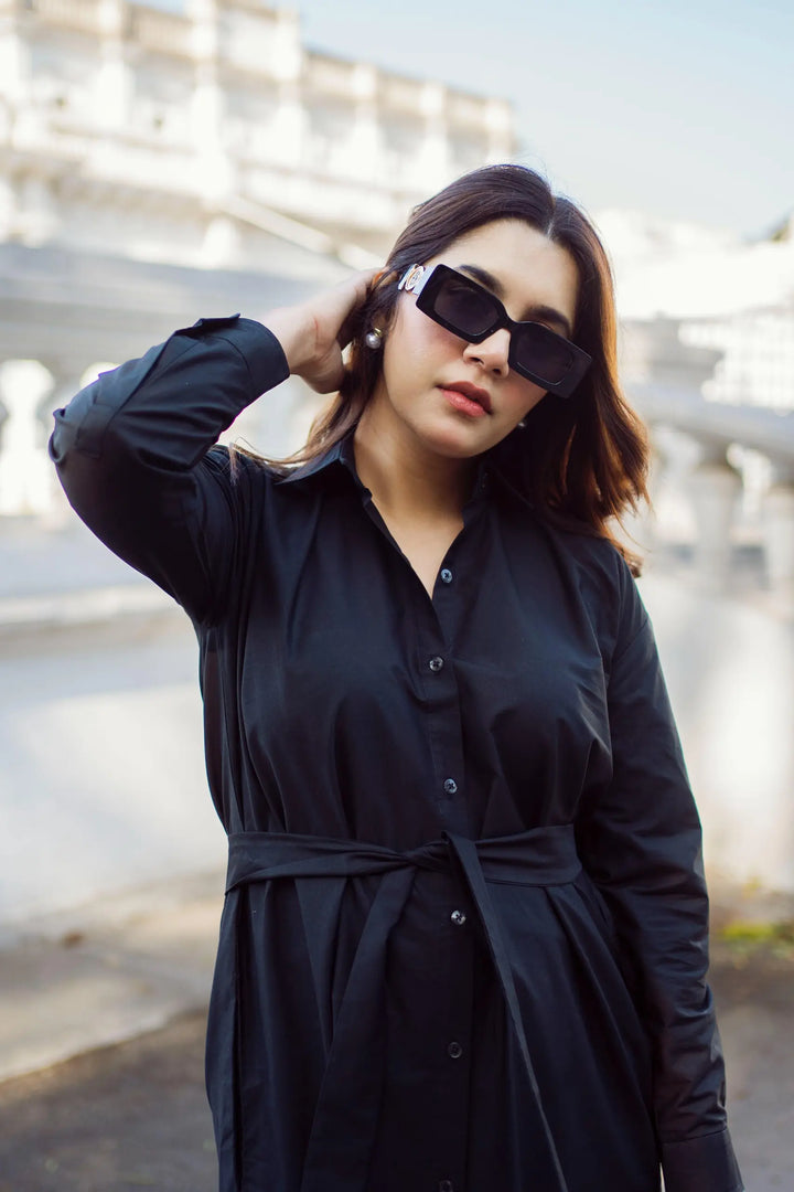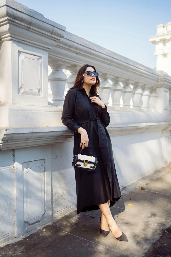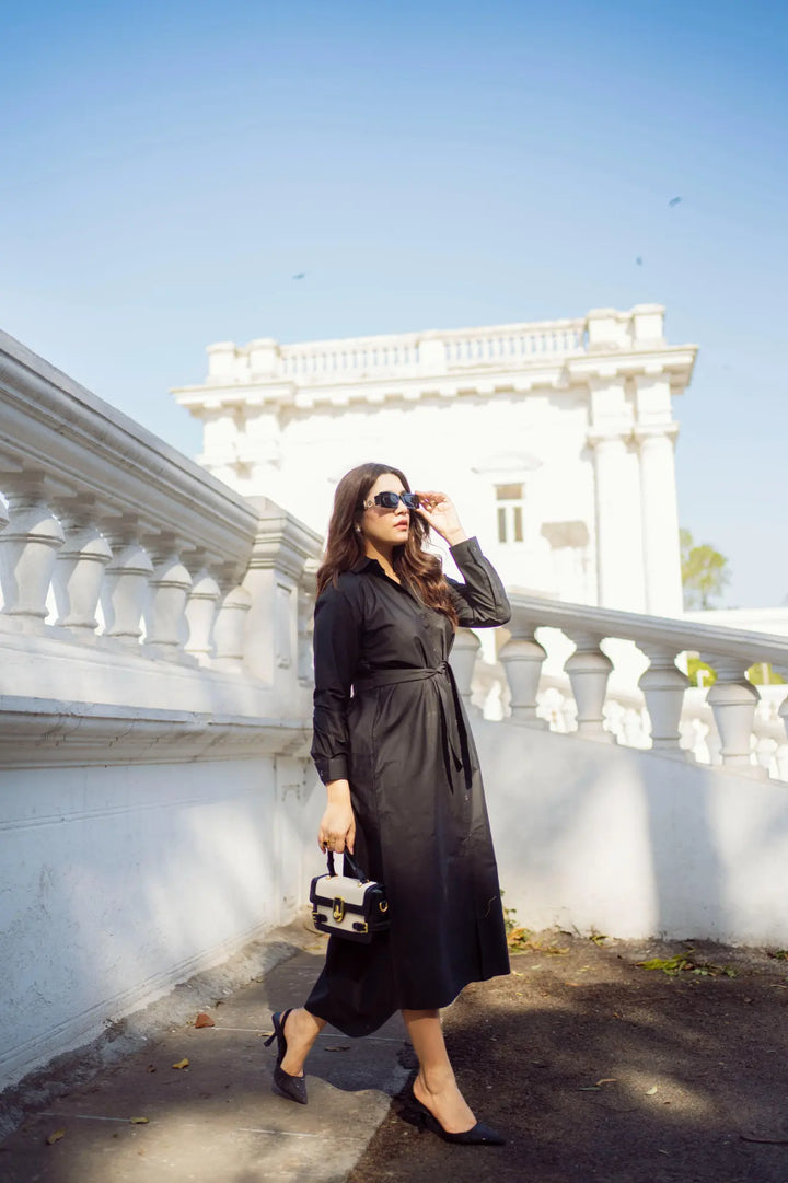 Product Detail: Refresh your everyday style with this smart black dress made from soft thick cotton. Designed with a front-button closure and a crisp shirt collar, it includes a matching fabric belt to define the waist and a front pocket for added ease. A perfect blend of comfort and sophistication for casual days or polished outings.