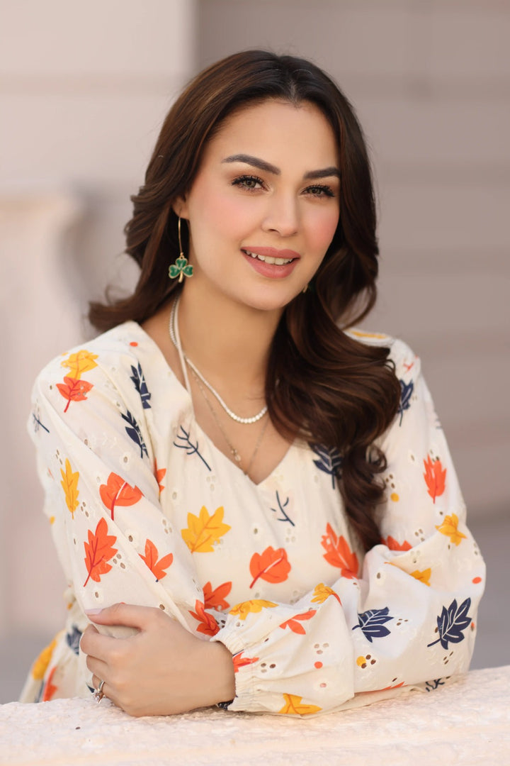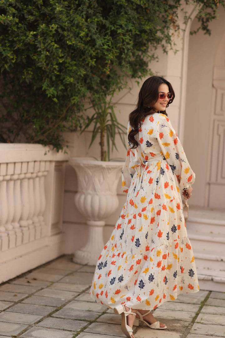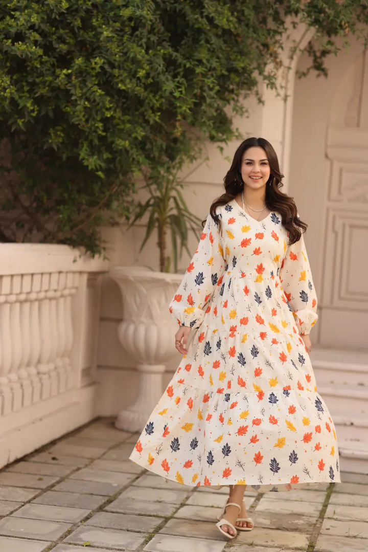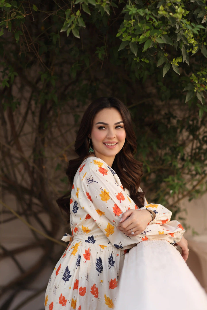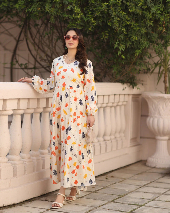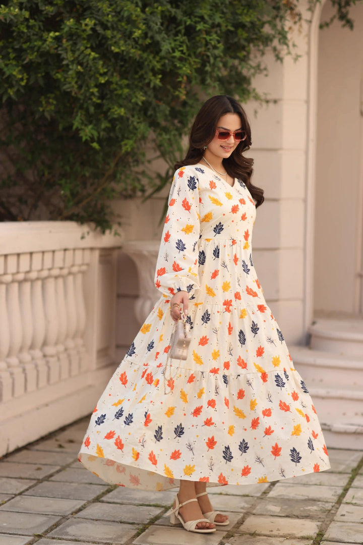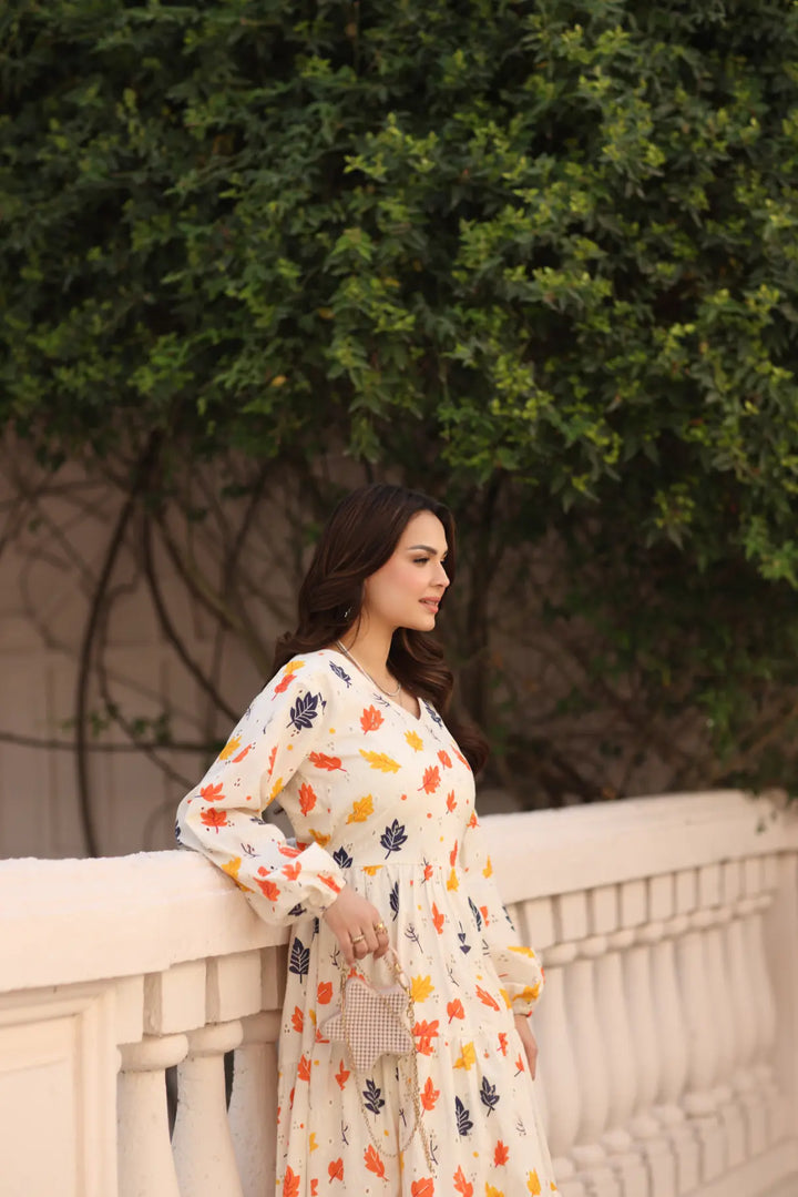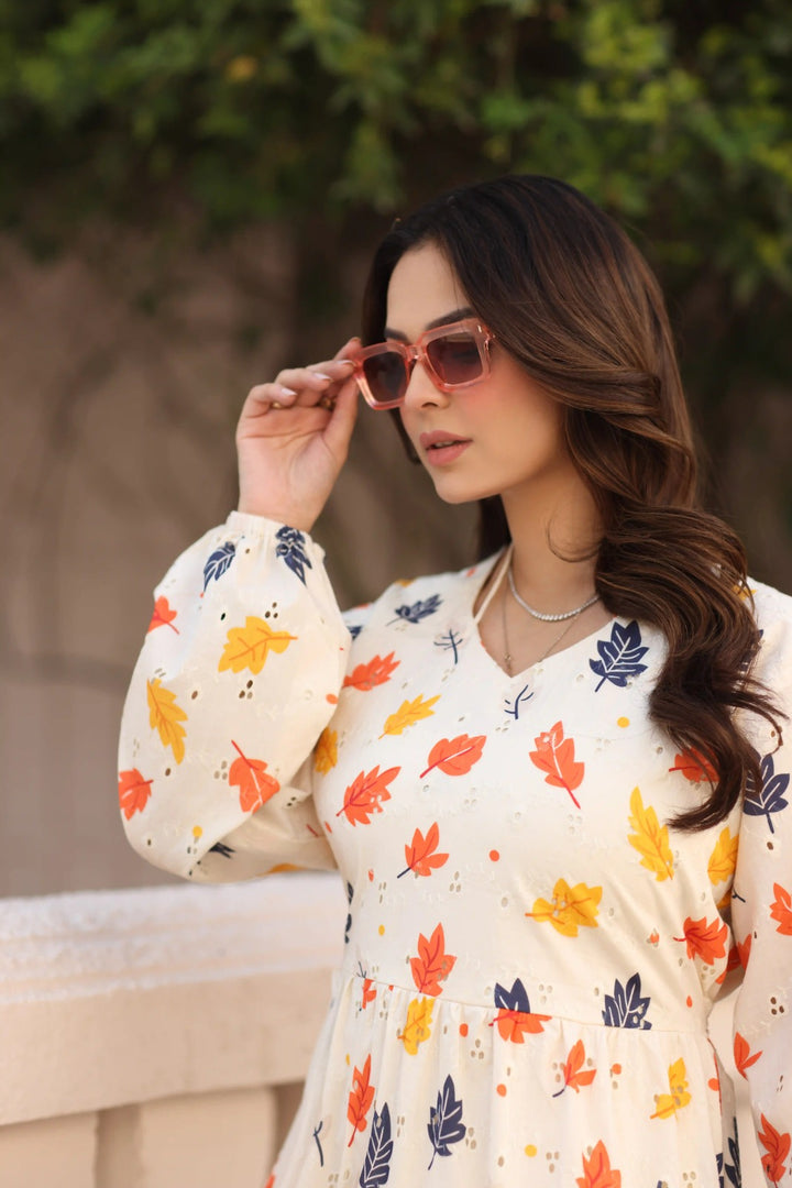 Your perfect transitional piece. This dress features a soft "vanilla cream" base in airy, textured lawn chicken (chikankari). We love the breezy, tiered silhouette and full bishop sleeves, all brought to life with a scattered print of colourful autumn leaves. Effortless boho-chic.