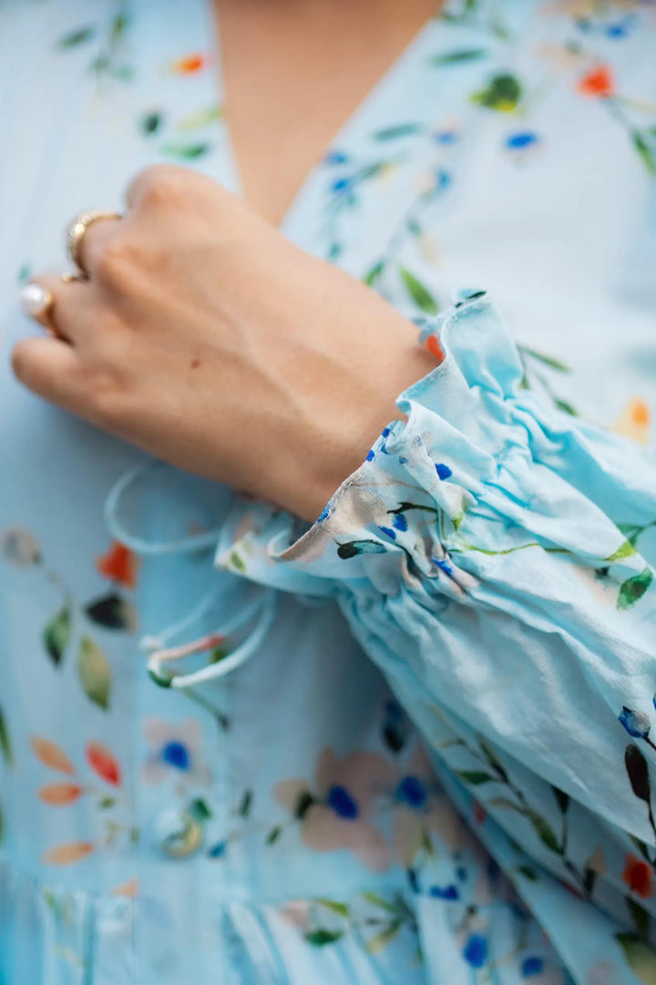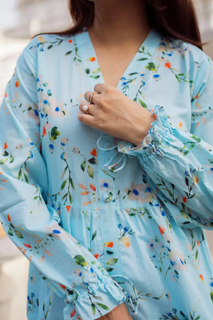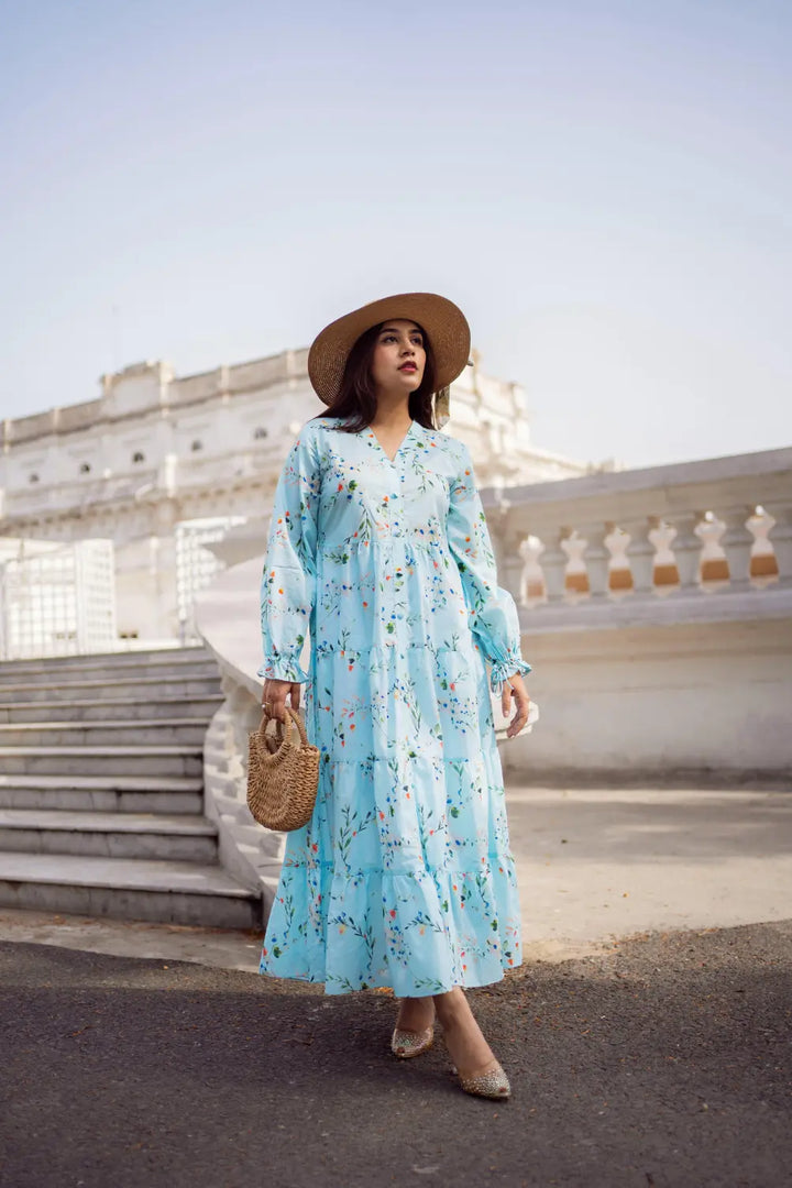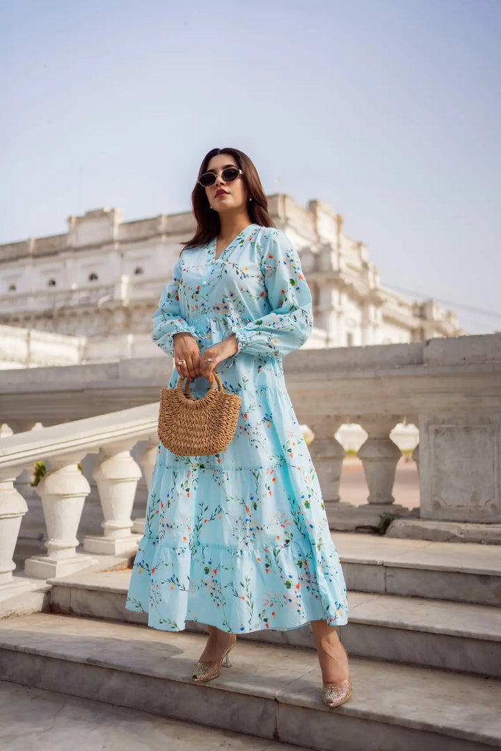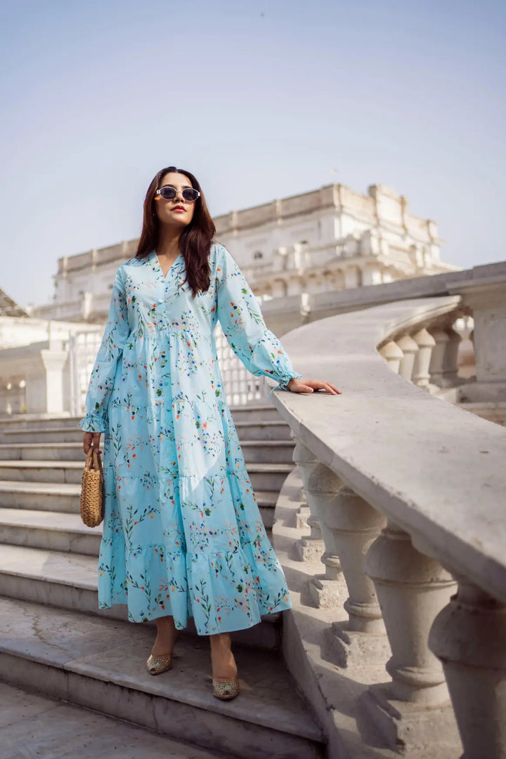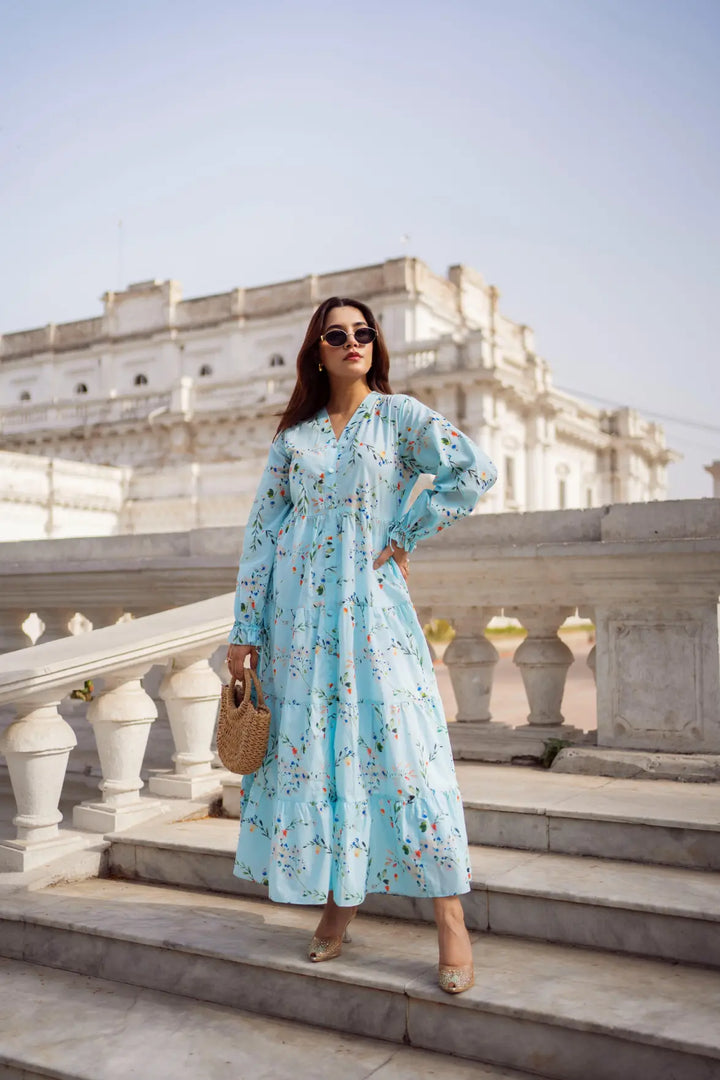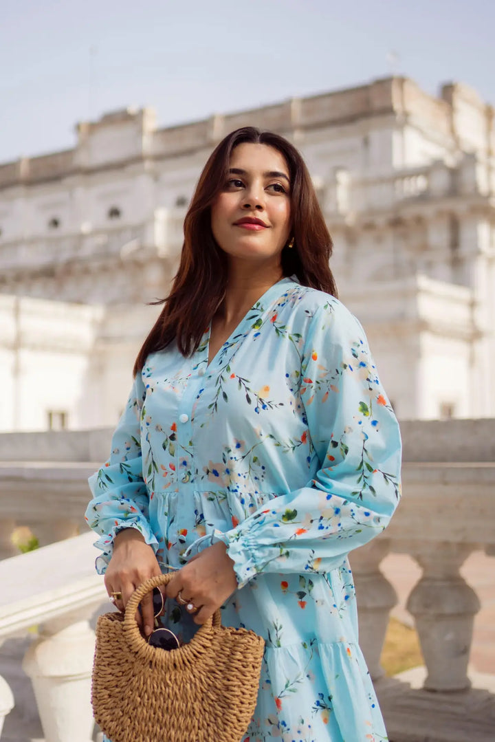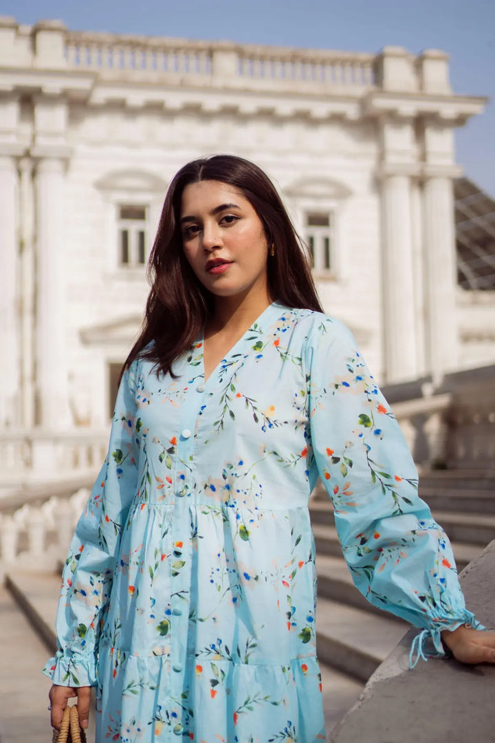 Product Details: Breezy and charming, this baby blue dress is crafted from soft 100% pure lawn fabric, perfect for warm-weather days. Adorned with a delicate all-over floral print, it features a flattering V-neckline, long gathered sleeves, and a tiered silhouette that flows beautifully with every step.