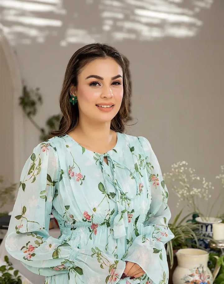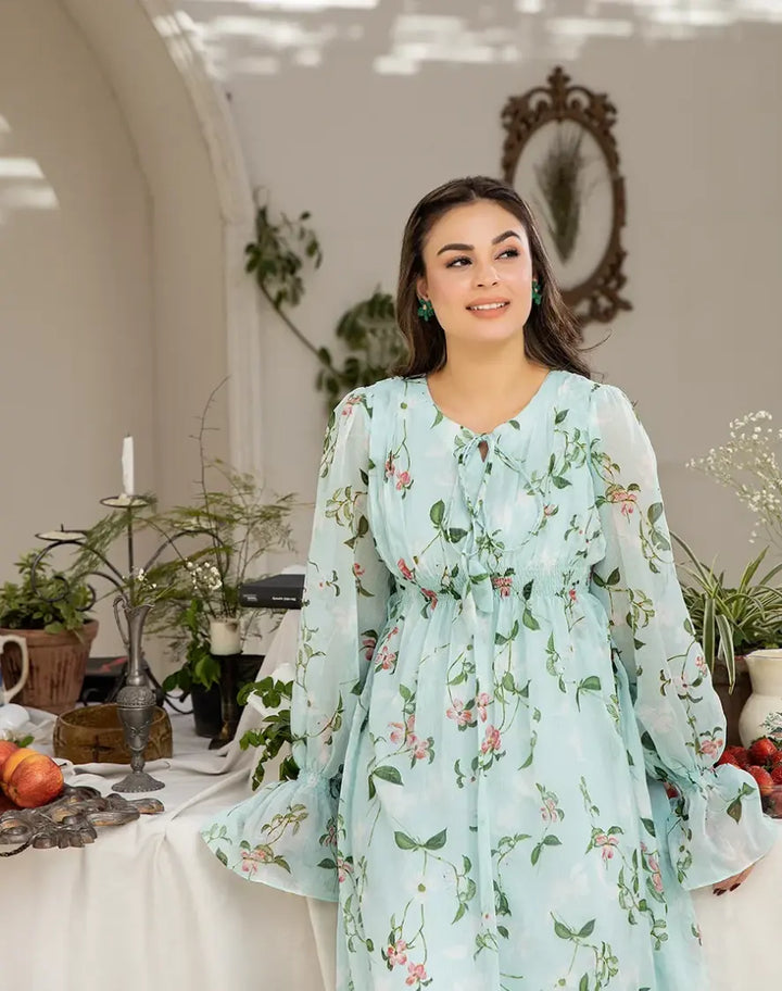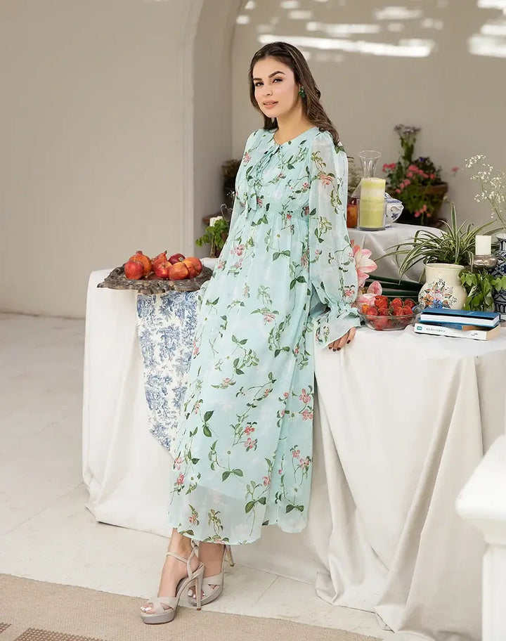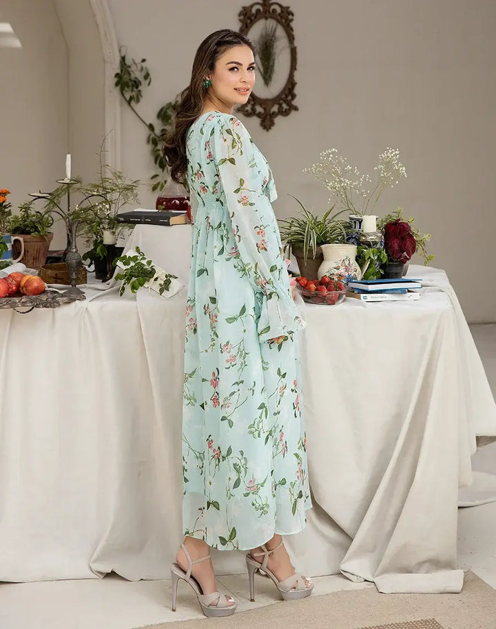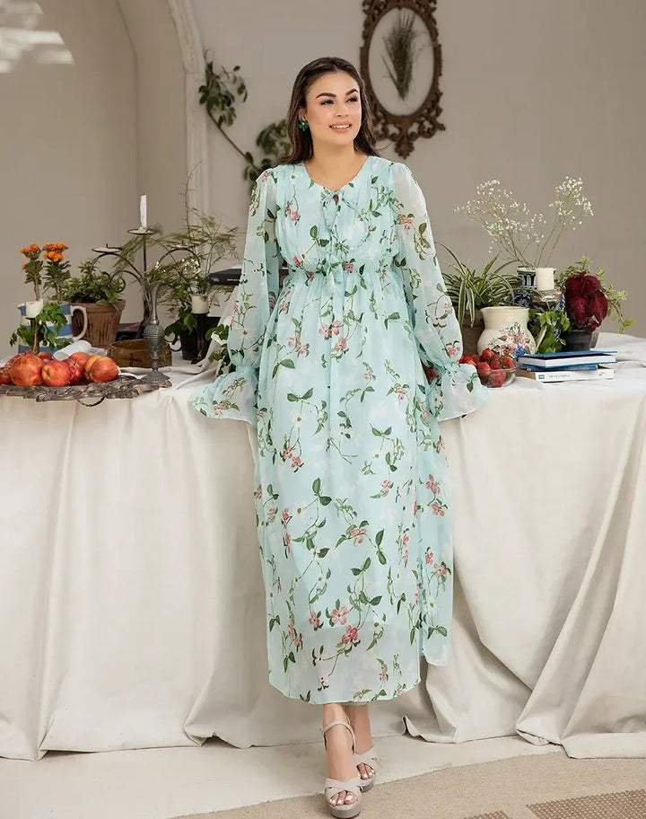 Product Detail: Stand out in style with our ultramarine green crinkle georgette long dress. Its rich color and flowing design ensure you'll turn heads wherever you go. Made from high-quality georgette fabric, this dress combines comfort and style effortlessly, making it a must-have addition to your wardrobe.
