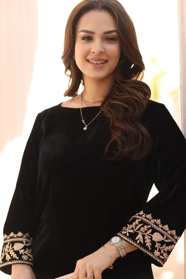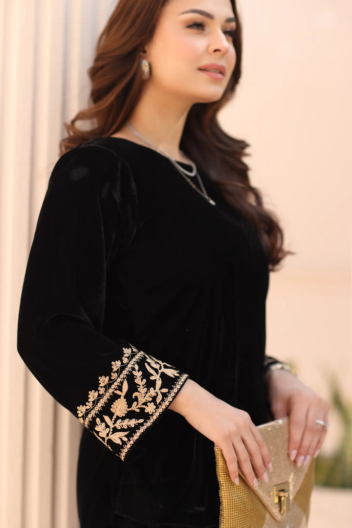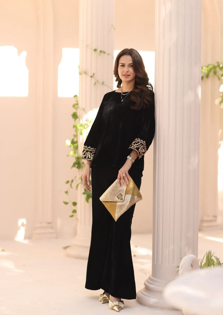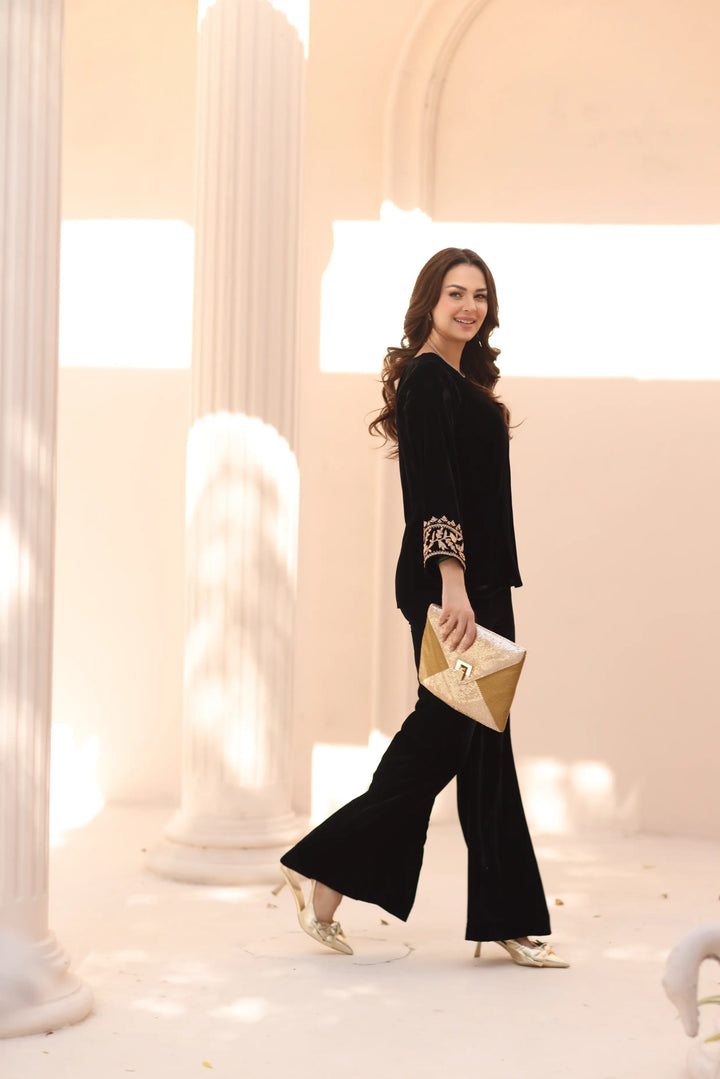 Timeless black velvet, redefined. This luxurious co-ord set pairs a chic, boat-neck tunic with matching flowy trousers. The true glamour lies in the details: exquisite, intricate gold embroidery that illuminates the statement flared sleeves. Pure sophistication.