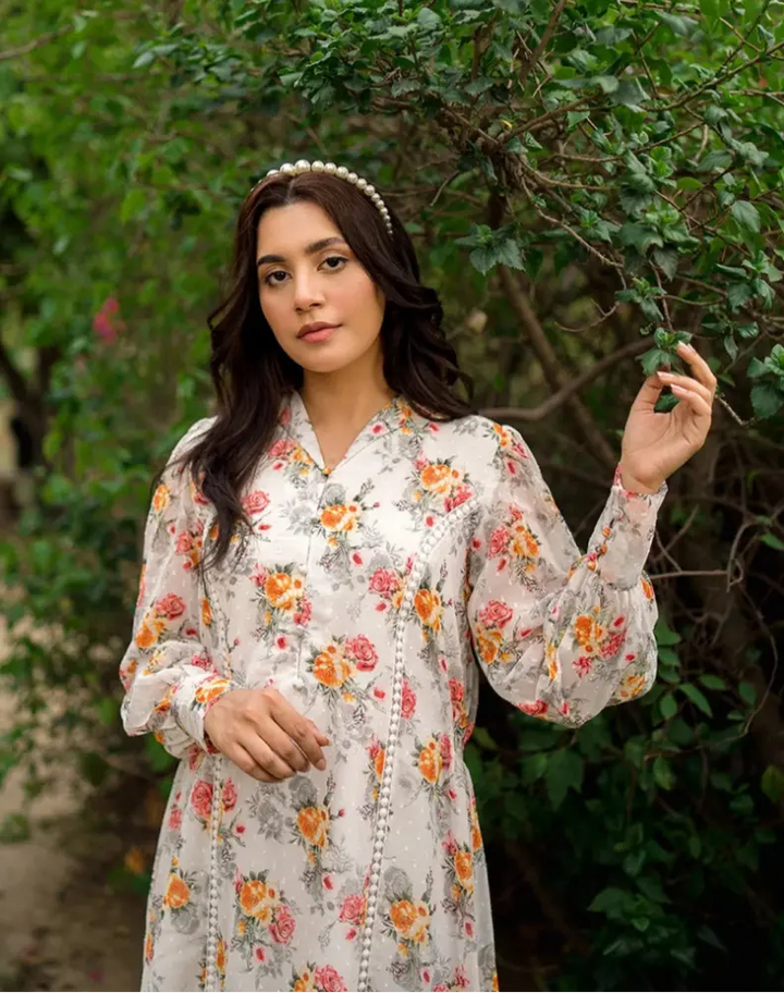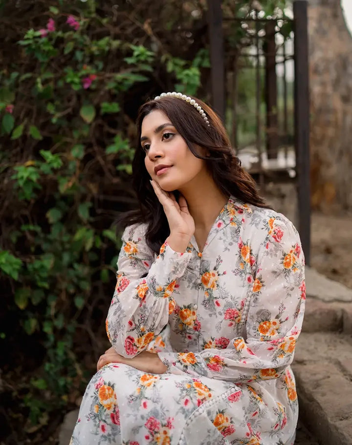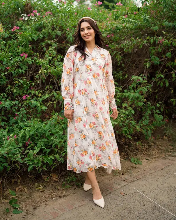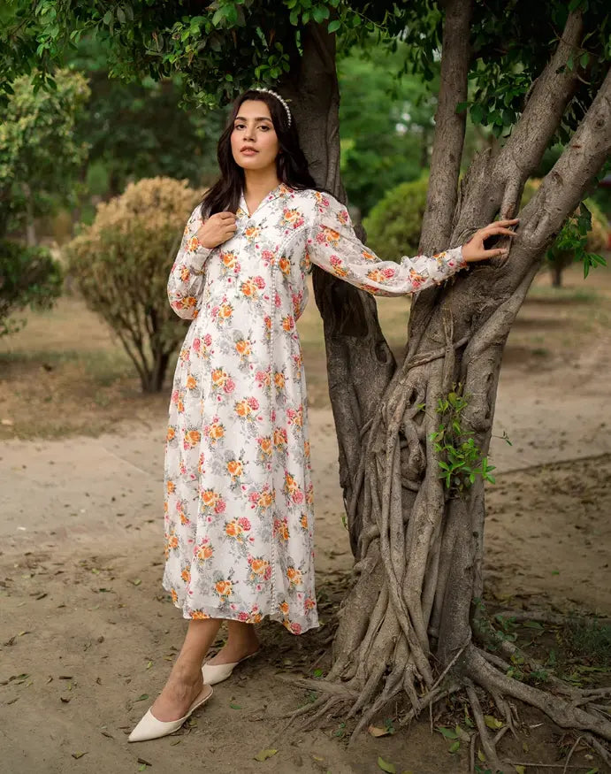 Product Detail: Elevate your style with our off-white brochia chiffon maxi dress, perfect for any occasion. This beautiful summer maxi dress features an elegant hue and a flowing silhouette, making it one of the best summer maxi dresses for any wardrobe.